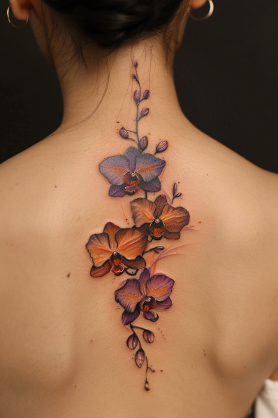 This stunning orchid vine tattoo flows elegantly down the center of the back, featuring a cascade of vibrant orchids that seem to bloom right from the skin. The design showcases rich hues of purple and orange, with each orchid petal meticulously detailed to create a lifelike and three-dimensional effect. The vine subtly trails down the spine, connecting the flowers in a natural and fluid motion, while the buds add a touch of anticipation as they appear ready to bloom.