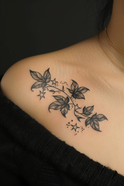 Now, I ve got to say, this tattoo is simply enchanting. The combination of ivy and stars brings together the best of nature and fantasy, making it perfect for someone who wants a tattoo that s both meaningful and a little bit mystical. The placement on the collarbone is just perfect too subtle enough to keep it personal, yet visible enough to make a statement. If you re after a tattoo that s as dreamy as it is stylish, this ivy vine with stars design definitely hits the mark. It s got that effortless blend of elegance and charm that s hard to resist!
