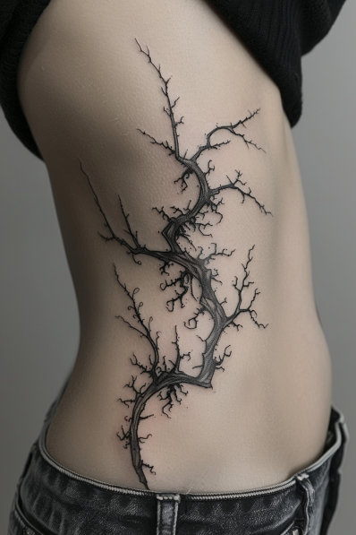 This blackwork thorny vine tattoo snakes its way up the ribcage with a dramatic and fierce presence. The design features a twisted, gnarled vine with sharp thorns that branch out like lightning bolts across the skin. The bold black lines and intricate detailing give this tattoo a raw, intense look, perfectly accentuating the curves of the body. The placement along the ribs adds to the edgy vibe, making it a design that demands attention.