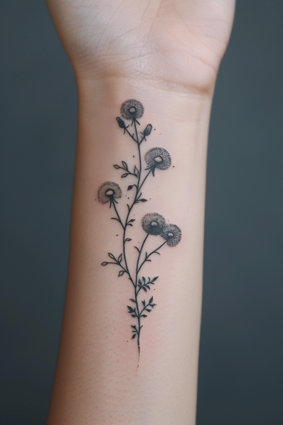 This delicate tattoo features a slender vine adorned with whimsical dandelion heads, each meticulously detailed to capture the light, airy feel of the seeds about to drift away. The design flows gently up the wrist, creating a subtle and elegant piece that feels both natural and ethereal. The fine line work and soft shading give the dandelions a realistic touch, making them almost appear to float above the skin.
