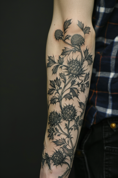 This thistle vine tattoo is an intricate and bold design that wraps around the forearm, showcasing the natural beauty of thistle flowers intertwined with flowing vines. The tattoo features meticulously detailed thistle blooms, with their spiky petals and textured leaves, all inked in rich black and gray tones. The vine gracefully winds its way up the arm, creating a seamless flow that highlights the tattoo s intricate details. The contrast between the sharpness of the thistle and the smooth curves of the vine adds a dynamic balance to the overall design.