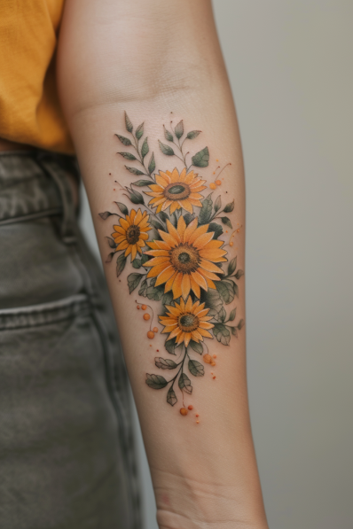 I ve got to say, this tattoo is absolutely uplifting. Sunflowers are known for symbolizing happiness, positivity, and a sunny disposition, and this design captures all of that beautifully. The forearm placement is perfect for a tattoo that you ll want to show off every time you catch a glimpse of it, it s like a little burst of sunshine on your skin. I love how the design is both bold and cheerful, making it a fantastic choice for anyone who wants their ink to be a daily reminder of the bright side of life. If you re after a tattoo that s full of life and energy, this sunflower vine is definitely a top pick!