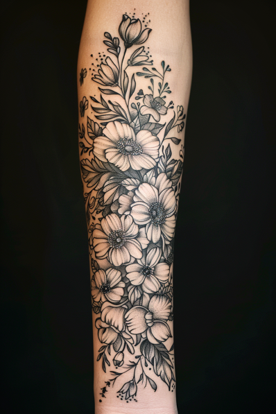 This mandala-inspired flower vine tattoo is a stunningly detailed piece that covers the forearm with a beautiful array of floral elements. The design features a flowing vine intertwined with intricate flowers, each petal and leaf drawn with precision and care. The mandala influence is evident in the symmetry and balance of the design, giving it a harmonious and almost meditative quality. The black and gray shading adds depth and dimension, making the flowers appear as though they are blooming right off the skin.