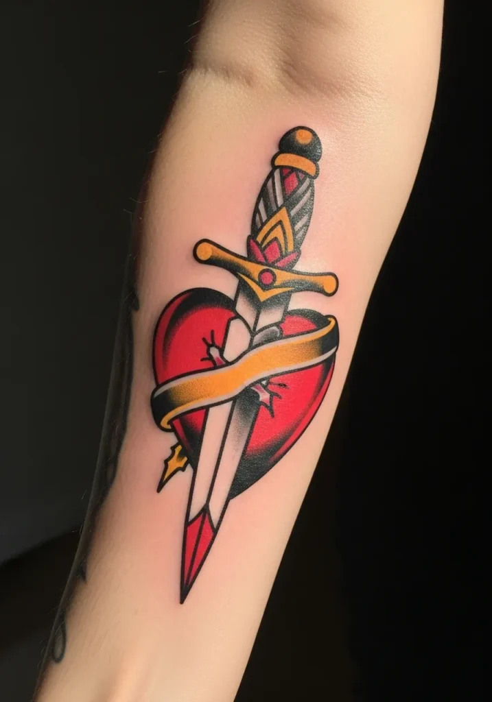This American traditional tattoo features a gleaming dagger piercing through a bold red heart, wrapped in a golden ribbon that adds a touch of softness to the fierce imagery. Placed neatly on the inner forearm, the medium-sized design showcases sharp black outlines, vibrant reds, and hints of yellow and gray that make it pop beautifully against the skin. The slight shading around the blade gives it a realistic depth that feels timeless and bold.