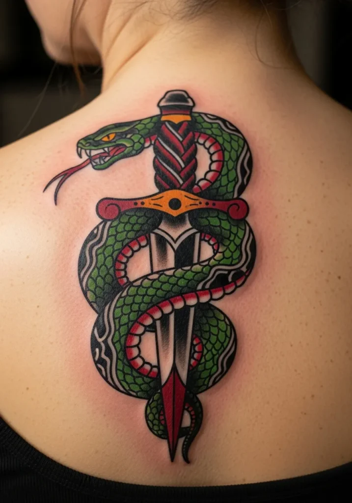 This striking back tattoo features a green snake wrapped tightly around a dagger, its fangs bared and tongue flicking out. The scales shimmer in tones of green, black, and red, giving the snake a lifelike texture. The bold black shading and orange details in the hilt make it pop perfectly against the skin.