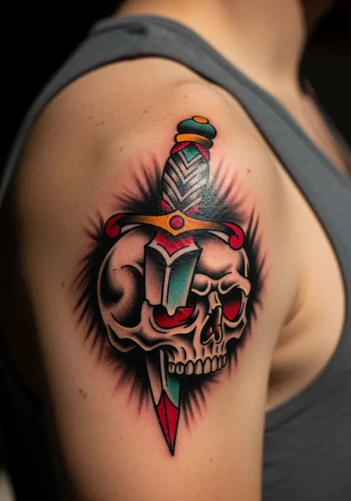This dramatic shoulder tattoo captures a dagger plunged into a skull, surrounded by dark shading that makes it look like it s glowing from within. The color palette sticks to the American traditional roots saturated reds, muted teals, and deep blacks with golden highlights. The placement across the shoulder adds to its bold, powerful presence.