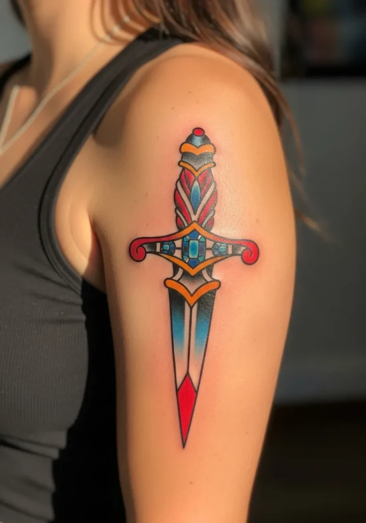 This medium-sized dagger tattoo on the upper arm is pure vintage perfection. The blade fades from blue to red, framed by gold and black detailing that gives it an almost jewel-like finish. The handle features intricate shapes and vibrant colors that instantly catch the eye while keeping that bold, traditional style intact.
