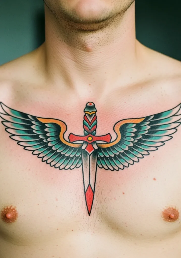 Stretching proudly across the chest, this tattoo features a dagger centered between two outstretched wings. The colors teal, orange, and black flow beautifully across the skin, giving it a sense of symmetry and motion. The dagger itself is clean and precise, perfectly placed to align with the body s natural shape.