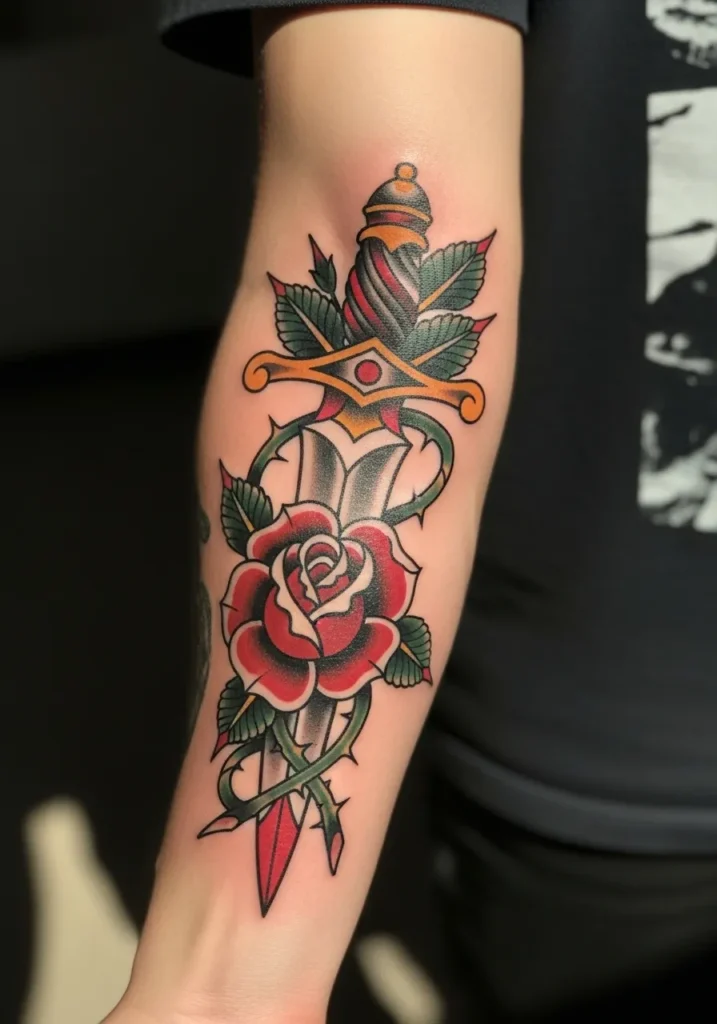 Dagger and Rose Forearm Tattoo Design
