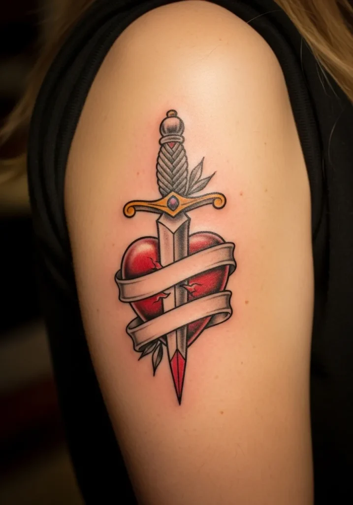 This classic American traditional tattoo features a dagger piercing a red heart wrapped in a blank ribbon, leaving space for a personal touch. The design sits beautifully on the upper arm, where the rich red and gold tones stand out against the skin. The leaves tucked behind the heart soften the look just enough to balance the bold lines.