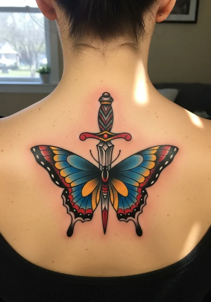 This stunning American traditional tattoo sits beautifully on the upper back, featuring a dagger piercing through the center of a vibrant butterfly. The wings burst with color bright blues, warm yellows, and touches of red all framed by bold black outlines. The dagger s handle is detailed with geometric patterns, tying perfectly into the old-school aesthetic that makes this piece timeless.