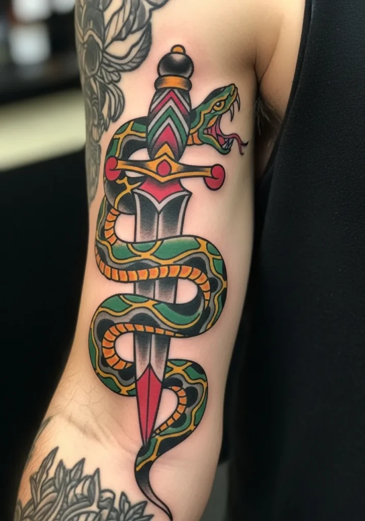 This striking tattoo shows a dagger wrapped by a vivid green and yellow snake, its fangs bared and ready to strike. The placement on the upper arm gives it room to breathe, allowing the long, winding serpent to coil dramatically around the blade. True to the American traditional style, the colors are bold and unapologetic, with heavy black shading and a punch of red at the dagger s tip that gives it that vintage edge.