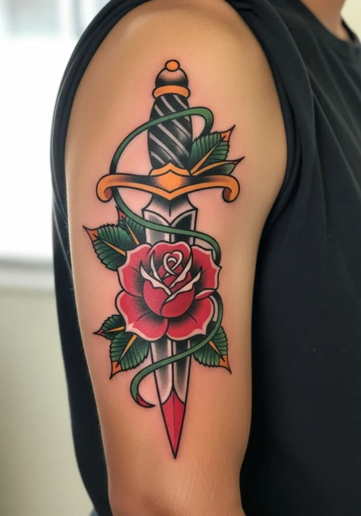 This classic American traditional design shows a red rose wrapped around a silver dagger, beautifully placed on the upper arm. The green leaves frame the piece perfectly, while the gold detailing in the handle adds a touch of richness. The proportions are spot on, making it look balanced and elegant against the arm s shape.