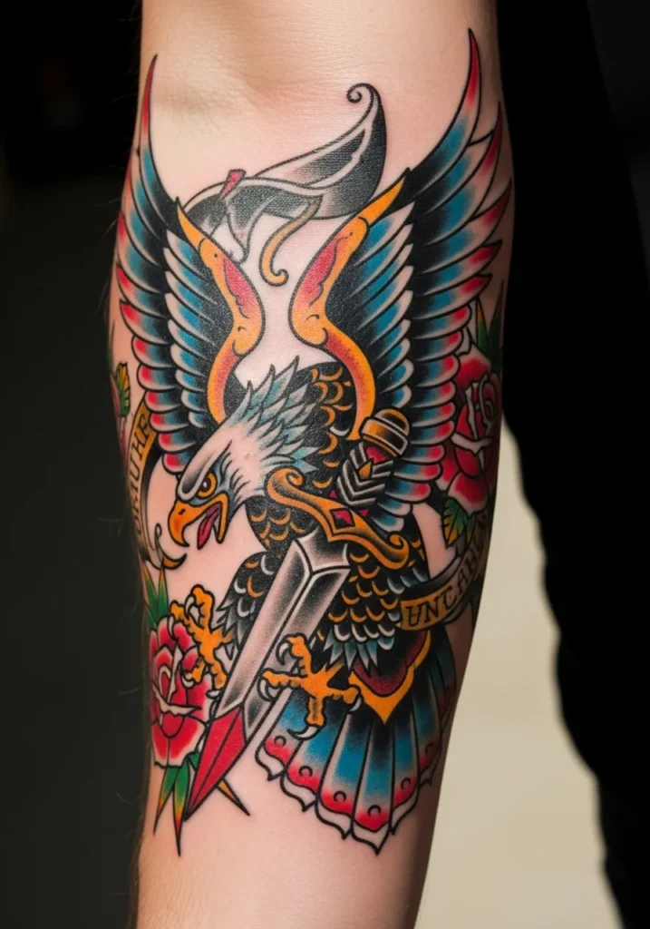 This bold forearm tattoo features an American eagle clutching a dagger in its talons, surrounded by red roses and banners with script. The wings burst outward in shades of blue, orange, and black, giving the piece incredible movement and life. The dagger gleams in silver with a red-tipped blade, completing the classic Americana theme perfectly.