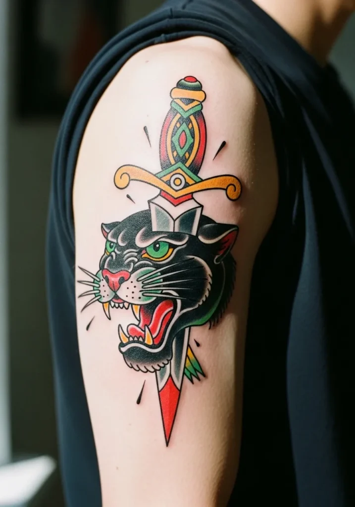 Here s a fierce upper arm tattoo showing a dagger piercing through the head of a roaring black panther. The bold green eyes, sharp teeth, and bright red tongue pop beautifully against the deep black fur and clean outlines. The dagger itself is richly decorated with geometric details and flashes of yellow and green that keep it eye-catching from every angle.