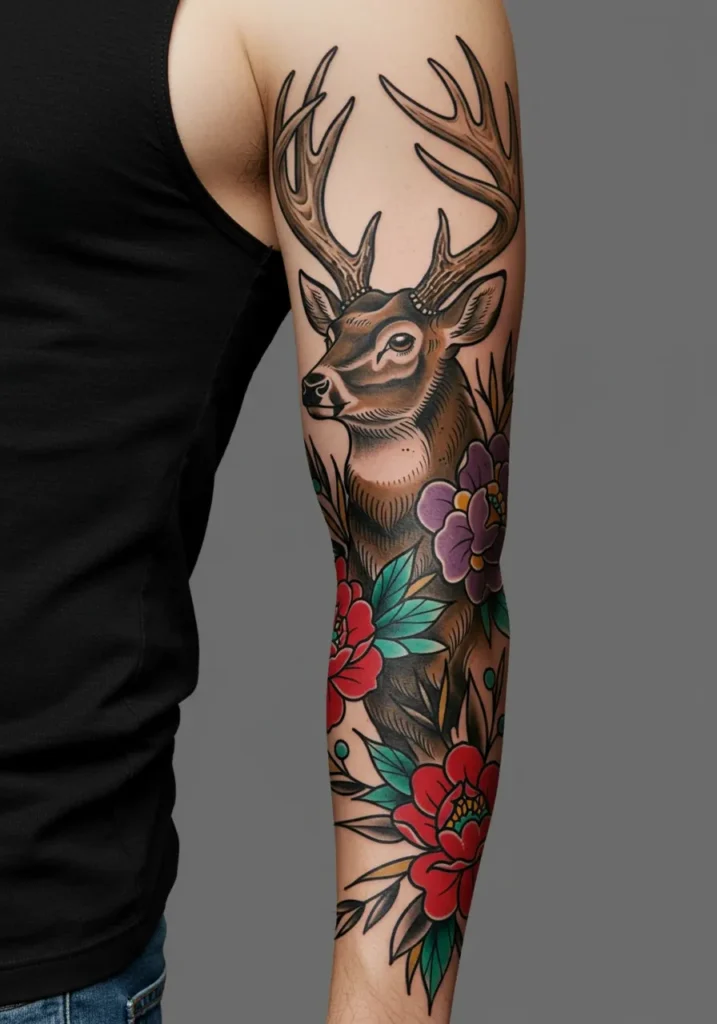 This stunning sleeve tattoo features a proud deer with tall, branching antlers standing gracefully among a field of bold, colorful flowers. The deer s soft brown shading is beautifully balanced with pops of bright red, purple, and green from the surrounding peonies and leaves. Clean black outlines and rich, saturated colors give the whole piece that gorgeous neo traditional look, with just the right mix of boldness and elegance. The antlers stretch up toward the shoulder, while the florals wrap naturally around the arm for a perfect flow from top to bottom.