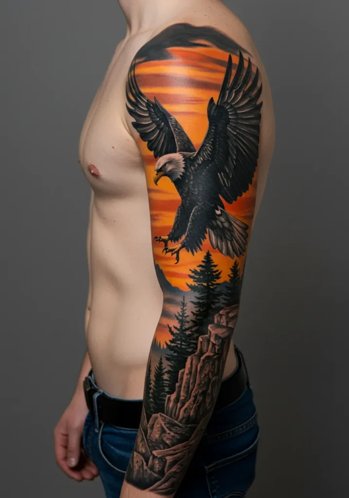 This striking sleeve tattoo features a fierce bald eagle swooping down against the backdrop of a dramatic orange sunset sky. The eagle s wings are fully spread, showing off beautifully shaded black feathers and intense detail in the face and talons. Below the eagle, towering pine trees and rocky cliffs add depth and balance to the scene, making the whole piece feel grounded yet full of motion. The vivid sunset colors blend perfectly into the dark landscape, wrapping the arm with warmth, contrast, and power.