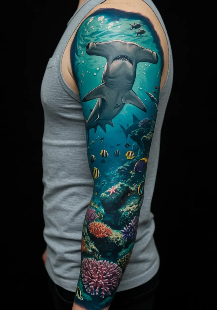 I think what makes this tattoo so impressive is how alive it feels. The hammerhead commands attention with its strong presence, but the bright coral and little fish give it a softer, playful edge. It has that perfect mix of strength and beauty, which I always love in a sleeve piece. Honestly, it feels like you re wearing a piece of the ocean right on your skin.