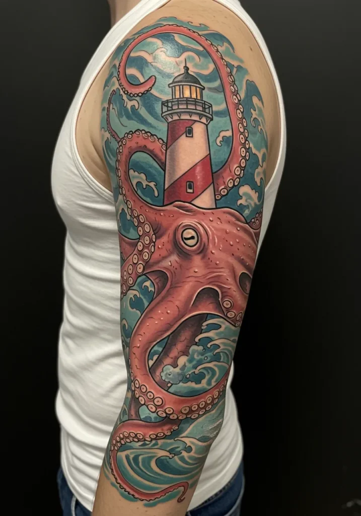 This eye-catching sleeve tattoo features a giant octopus wrapping its curling tentacles around a towering red and white striped lighthouse. The design is brought to life with bold lines, soft shading, and a gorgeous mix of teal blues and soft coral reds. Waves crash through the background, adding so much energy and motion, while the lighthouse stands tall and steady right at the heart of the chaos. The flow of the tentacles makes this tattoo fit beautifully along the curve of the arm, tying everything together in the most perfect way.