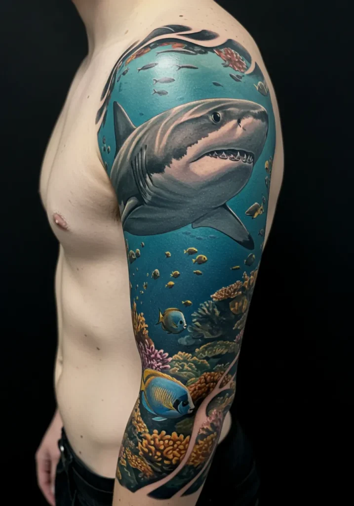 This breathtaking sleeve tattoo captures the beauty and power of the ocean in such an incredible way. Front and center swims a massive great white shark, its sharp features detailed with soft shading that makes it feel almost alive. Surrounding the shark is a vibrant underwater world filled with colorful coral reefs, playful fish, and gentle waves of turquoise blue. Every little fish and coral branch adds life and motion to the piece, giving the whole sleeve that perfect underwater scene vibe.