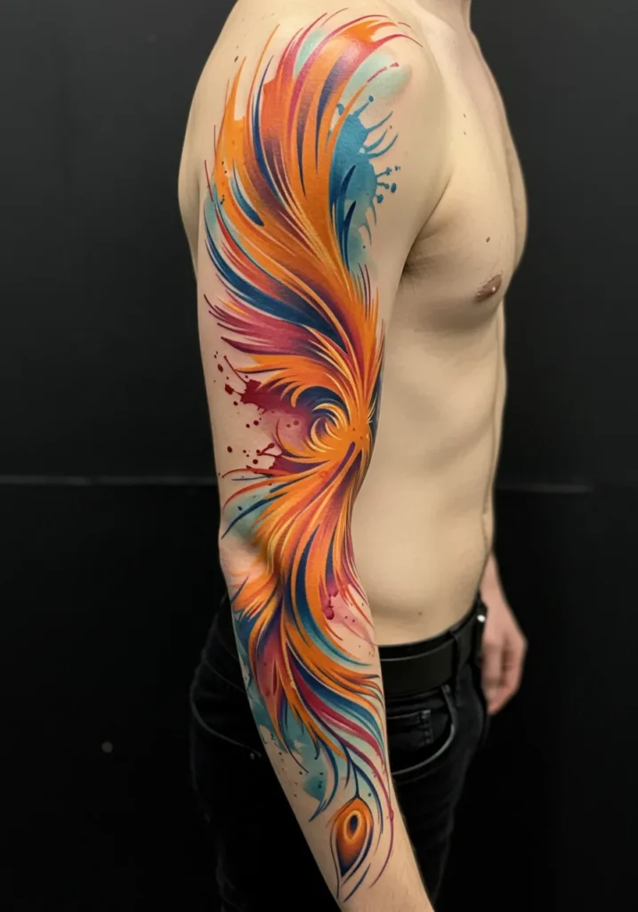 This stunning sleeve tattoo is a total showstopper with its swirling, feather-like shapes and bold splashes of color. The design flows beautifully from shoulder to wrist, wrapping the arm in bright orange, deep blue, teal, and soft purple. Toward the wrist, you can spot the eye of a peacock feather, adding that little extra detail that ties the whole piece together. The watercolor effect makes the colors melt into each other, while playful splatters give it a modern, artistic vibe.