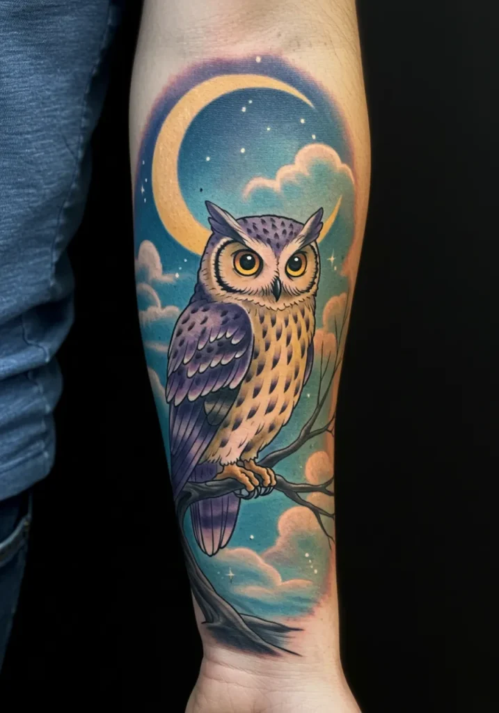 This enchanting forearm tattoo features a wide-eyed owl perched gracefully on a slender branch beneath a glowing crescent moon. The owl is beautifully detailed in soft purples and warm creams, with just the right amount of bold linework to make those feathers pop. Behind the owl, soft blue skies and fluffy clouds frame the scene, scattered with tiny stars that add a little extra magic. The whole piece wraps perfectly around the forearm, creating a dreamy nighttime vibe that feels straight out of a storybook.