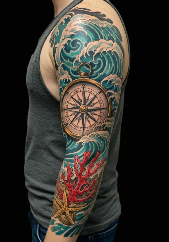 This stunning sleeve tattoo brings together the energy of the sea with a bold nautical vibe. At the center sits a classic compass, framed by powerful teal waves that curl and crash beautifully along the upper arm. The design flows downward into a vibrant underwater scene, with bright red coral, a soft yellow starfish, and gentle sandy textures adding even more life and color. The shading and highlights give every element a perfect balance of softness and strength, while the gold and black details on the compass make it really pop against the cooler ocean tones.