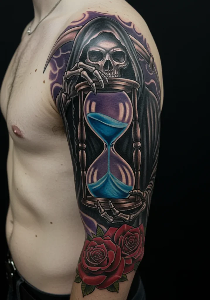 This bold upper arm tattoo features the classic Grim Reaper holding an oversized hourglass, with piercing blue sand slipping away between the glass chambers. The skeleton figure is cloaked in deep black with soft purple shading that adds depth and drama. Below the hourglass, two vivid red roses bloom at the edge of the design, offering a perfect contrast to the darker elements. Every detail, from the sharp bony fingers to the soft glow on the glass, feels sharp and carefully crafted.