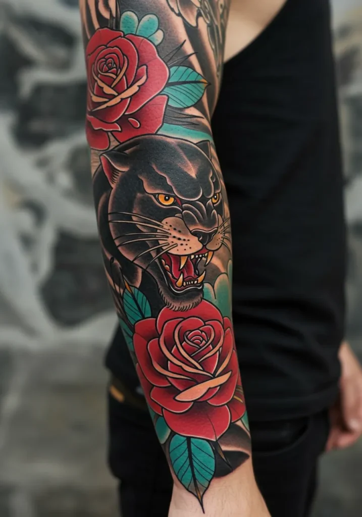 This bold sleeve tattoo brings together the fierce energy of a snarling black panther with the soft beauty of blooming red roses. The panther takes center stage with its piercing yellow eyes, sharp teeth, and sleek black fur, all shaded to perfection for maximum depth and drama. Surrounding the panther, the roses pop with rich reds and vibrant green leaves, adding balance and softness to the intense vibe of the piece. The classic old-school tattoo style shines through with thick black outlines and saturated colors that make the whole design feel strong and timeless.