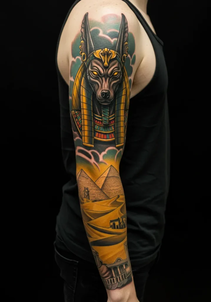This stunning full sleeve tattoo features the powerful image of Anubis, the ancient Egyptian god of the afterlife. The jackal-headed figure is brought to life with bold golden armor, intricate detailing, and piercing yellow eyes that seem to follow you wherever you move. The background flows smoothly into the desert landscape below, showcasing the iconic pyramids, temple ruins, and winding sandy paths under soft pink and teal-toned skies. The rich colors and sharp outlines give this piece a beautiful balance between realism and neo traditional flair.