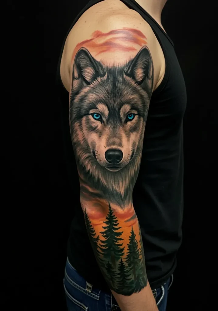 This incredible sleeve tattoo showcases the intense gaze of a wolf with piercing blue eyes, surrounded by a vivid sunset sky and towering pine trees. The wolf s fur is shaded with soft browns and grays, giving it a lifelike texture that feels almost touchable. Behind the majestic face, rich orange and pink tones melt into the sky, setting the perfect backdrop for the dark silhouettes of the forest below. The placement flows naturally down the arm, with the design wrapping smoothly without losing any detail along the way.