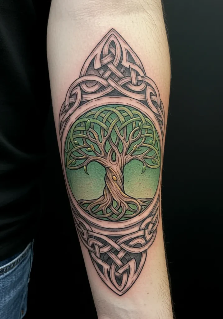 This beautiful forearm tattoo features the iconic Tree of Life, wrapped in an intricate frame of Celtic knotwork. The tree itself is woven together with detailed roots and branches, symbolizing connection and balance between earth and sky. Soft greens bring the background to life, while the bold black outlines and knot patterns add a strong and structured feel to the design. The placement is perfect for the forearm, allowing the piece to stand out without overwhelming the space.