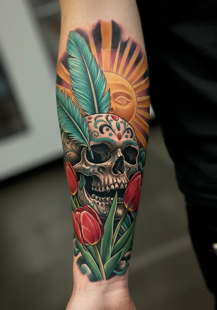 This gorgeous forearm tattoo features a beautifully shaded skull wrapped in bright red tulips, soft teal feathers, and warm golden rays of the sun. The skull itself has delicate ornamental details etched into its surface, adding a touch of elegance to the dark and moody vibe. The tulips bring in a burst of color and life, while the feather and glowing sun give the whole piece a sense of balance and lightness. The composition flows perfectly with the shape of the forearm, letting every little detail shine.