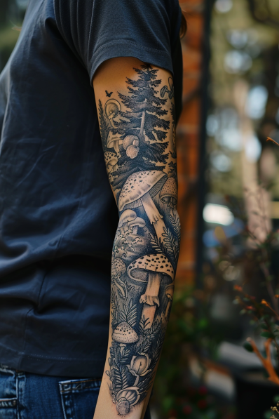 This intricate tattoo sleeve captures the enchanting atmosphere of a dense forest floor, complete with towering trees, detailed foliage, and a variety of mushrooms. The mushrooms, depicted in different sizes and shapes, are the centerpiece of the design, their spots and textures rendered with incredible detail. The surrounding trees and plants add depth and complexity, creating a scene that feels both grounded and mystical. The black and gray shading throughout the sleeve gives it a timeless, woodcut-like appearance, making the entire design feel like a beautifully illustrated storybook page.