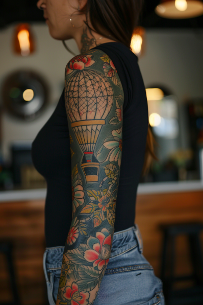 Hot Air Balloon and Floral Sleeve Tattoo
