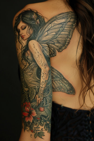 This mesmerizing tattoo sleeve features a graceful fairy with delicate, shimmering wings, surrounded by blooming flowers. The fairy, with her serene expression and flowing dark hair, is depicted with intricate details that bring her to life. Her wings are adorned with subtle sparkles, adding a touch of magic to the design. Below her, vibrant flowers in shades of red and green create a beautiful contrast against the fairy s soft, ethereal presence. The combination of the enchanting fairy and the lush floral elements makes this sleeve a perfect blend of fantasy and nature.