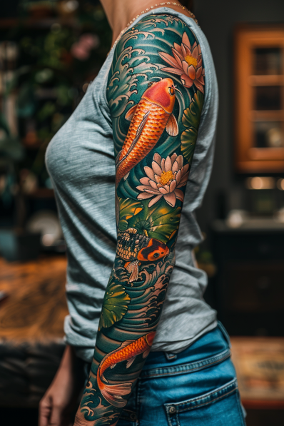 This captivating tattoo sleeve features a dynamic scene of koi fish swimming gracefully among blooming lilies. The koi, with their shimmering orange and gold scales, are the focal point of the design, gliding through waves of deep blue water. The lilies, depicted in soft pinks and whites, float serenely on the surface, adding a touch of calmness to the otherwise lively composition. The contrast between the vibrant koi and the delicate lilies creates a harmonious balance that flows beautifully down the arm, making this tattoo a stunning representation of both strength and tranquility.