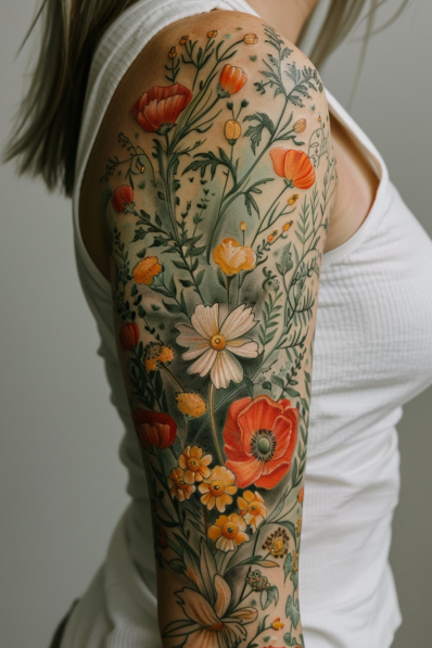 This enchanting tattoo sleeve features a variety of delicate wildflowers, gracefully winding their way down the arm. The design highlights soft poppies, daisies, and other dainty blooms, all rendered in warm tones of orange, red, and yellow. The flowers are intertwined with slender green stems and leaves, giving the sleeve a natural, flowing appearance. The light color palette and detailed line work create a soft, feminine vibe that s both timeless and elegant. The overall effect is like wearing a piece of a sunlit meadow, making it an ideal choice for those who appreciate the subtle beauty of nature.