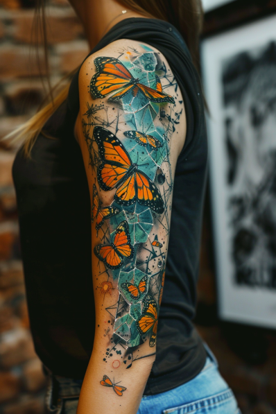 This striking tattoo sleeve features butterflies delicately emerging from shards of shattered glass, symbolizing transformation and the beauty that can arise from chaos. The butterflies, with their vibrant orange and black wings, seem to burst forth from the sharp fragments, creating a powerful visual contrast between fragility and resilience. The shattered glass, depicted in cool tones of blue and green, adds a dynamic, almost explosive element to the design, enhancing the sense of movement and freedom as the butterflies take flight.