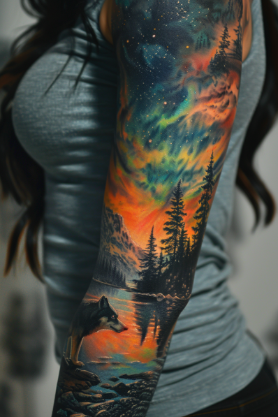 This breathtaking tattoo sleeve captures the mystical beauty of the aurora borealis, stretching across the night sky with vibrant hues of green, blue, and orange. Below the glowing lights, a serene wilderness scene unfolds, featuring tall pine trees and a still lake reflecting the colorful sky. At the bottom of the sleeve, a pair of wolves stand watchfully on the rocky shore, adding a touch of wild elegance to the design. The contrast between the vivid, otherworldly sky and the calm, natural landscape creates a stunning visual experience that wraps around the arm.