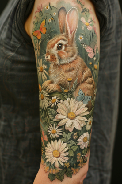 Bunny Rabbits with Daisies and Butterflies Sleeve Tattoo