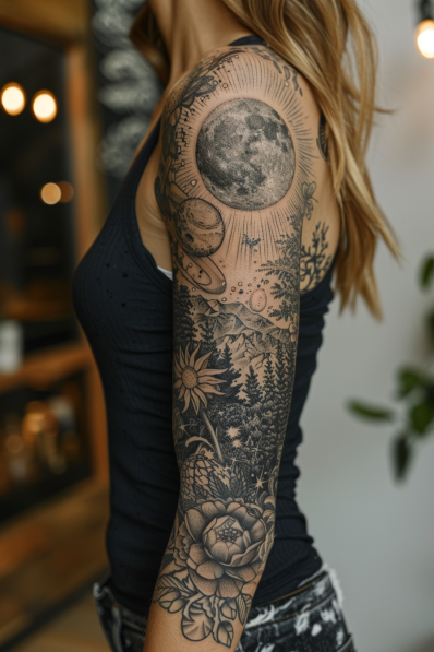 This stunning tattoo sleeve is a breathtaking depiction of the natural world, seamlessly blending celestial and earthly elements. Dominating the upper arm is a detailed moon, surrounded by planets and stars, casting a serene glow over the entire scene. Below, a tranquil landscape unfolds with towering pine trees, majestic mountains, and blooming flowers like sunflowers and roses. The intricate linework and shading give the tattoo a beautifully textured, almost three-dimensional feel. The contrast between the celestial bodies and the grounded nature elements creates a harmonious balance, making this sleeve a true masterpiece.