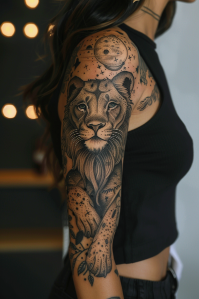 I m totally in awe of this lion and moon sleeve! The lion looks so regal and fierce, and it s like you can feel the power and confidence radiating from it. Pairing it with the moon and stars was a genius move it adds this mystical, almost magical vibe that elevates the whole design. The shading is just perfect, giving the tattoo depth and texture that make it stand out. If you re someone who values strength, leadership, and a bit of mystery, this sleeve is definitely a powerful statement piece.