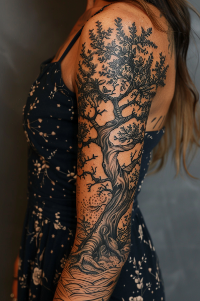 This impressive tattoo sleeve is a captivating depiction of the Tree of Life, with its intricate branches and roots spreading across the arm. The tree, rendered in fine black ink, showcases a blend of strength and elegance, with twisting roots anchoring it firmly to the ground and branches reaching upward, symbolizing growth and connection. The detailed bark and delicate leaves add depth to the design, while the subtle shading brings the tree to life. The entire sleeve exudes a sense of grounding and unity, making it a powerful symbol of resilience and personal growth.
