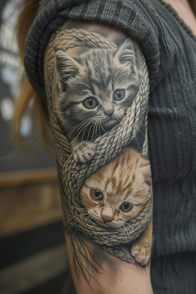 This heartwarming tattoo sleeve showcases two adorable kittens snuggled up together, playfully wrapped in a thick rope. The kittens, one gray and one ginger, are rendered in lifelike detail, with soft fur, bright eyes, and innocent expressions that capture the essence of their playful nature. The rope, intricately designed, adds texture and depth to the tattoo, making it look almost three-dimensional. The combination of the cute kittens and the detailed rope work creates a cozy and endearing scene that wraps around the arm, perfect for any cat lover.