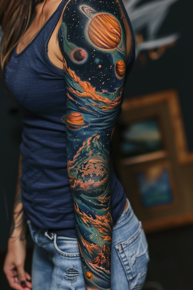 I m completely blown away by this cosmic planets sleeve! There s something so awe-inspiring about having the vastness of space captured so vividly on your skin. The colors are out of this world (pun intended), and the way the planets are arranged makes it feel like you re looking into a telescope at the wonders of the universe. What I love most is how the design doesn t just sit on the arm it wraps around, creating this immersive experience that s both visually stunning and deeply symbolic. If you re into space or just want a tattoo that s as expansive as your imagination, this sleeve is definitely a winner.