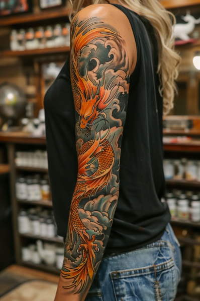 I m really impressed by this Japanese dragon sleeve! The way the dragon is depicted with such bold colors and intricate details makes it look like it s alive, swirling right off the skin. There s something so powerful about the design it s like carrying a symbol of strength and protection wherever you go. The contrast between the fiery dragon and the cool, swirling clouds adds a nice balance, making the whole piece feel dynamic and full of energy. If you re into tattoos that are both traditional and fiercely bold, this dragon sleeve is an absolute masterpiece.
