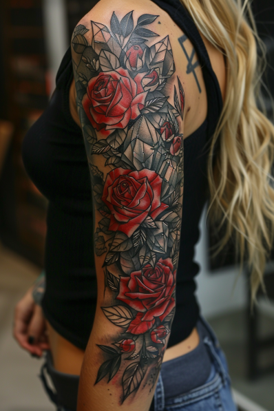 This eye-catching tattoo sleeve is a unique fusion of sharp crystal shards and lush red roses, creating a striking contrast that draws the eye. The crystal shards, depicted in cool, translucent tones, pierce through the rich, crimson petals of the roses, adding an edgy, almost otherworldly element to the design. The roses, with their intricate details and deep red hues, symbolize love and passion, while the crystal shards introduce a sense of strength and resilience. The interplay between the soft, organic forms of the roses and the hard, angular shapes of the crystals makes this sleeve a bold statement piece.