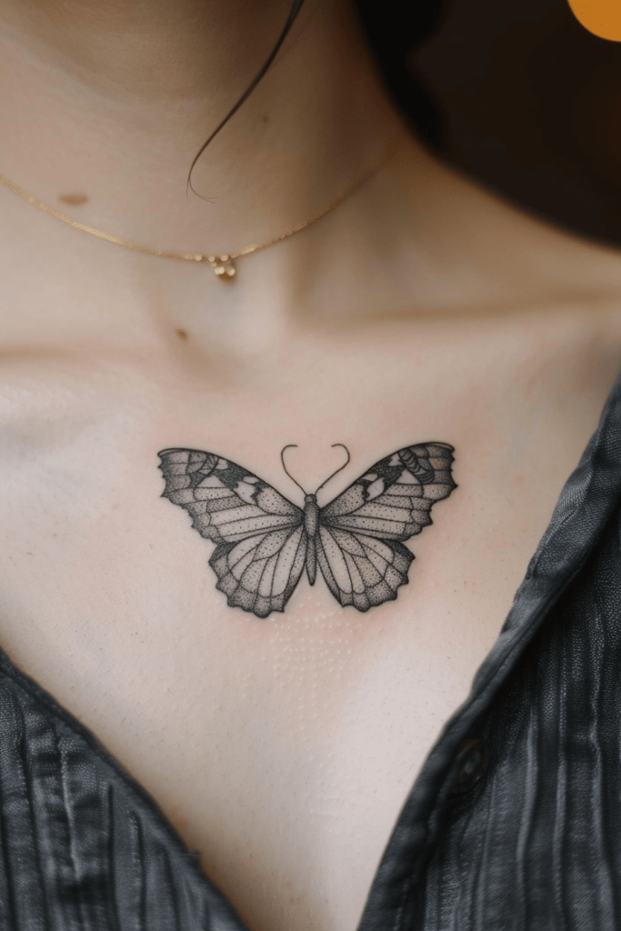 This collarbone butterfly tattoo captures grace and elegance. The fine lines and detailed shading create a realistic butterfly that sits perfectly on the skin. Its placement just below the collarbone makes it both visible and tasteful, adding a touch of beauty to this delicate area.