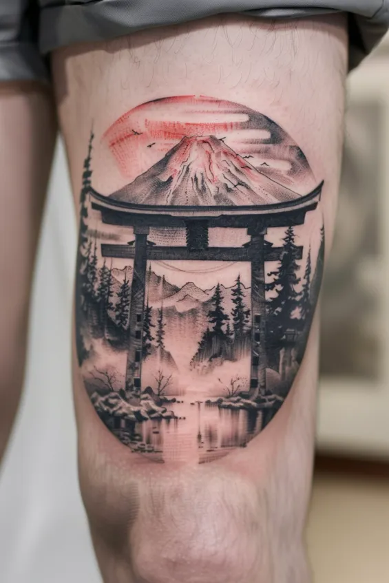 There s something about this design that feels deeply spiritual. The torii gate symbolizes transition and new beginnings, while Mount Fuji represents strength and endurance. Together, they create a piece that feels both grounding and inspiring. If you love tattoos that tell a story and capture the beauty of Japan s natural and cultural heritage, this one is absolutely unforgettable.